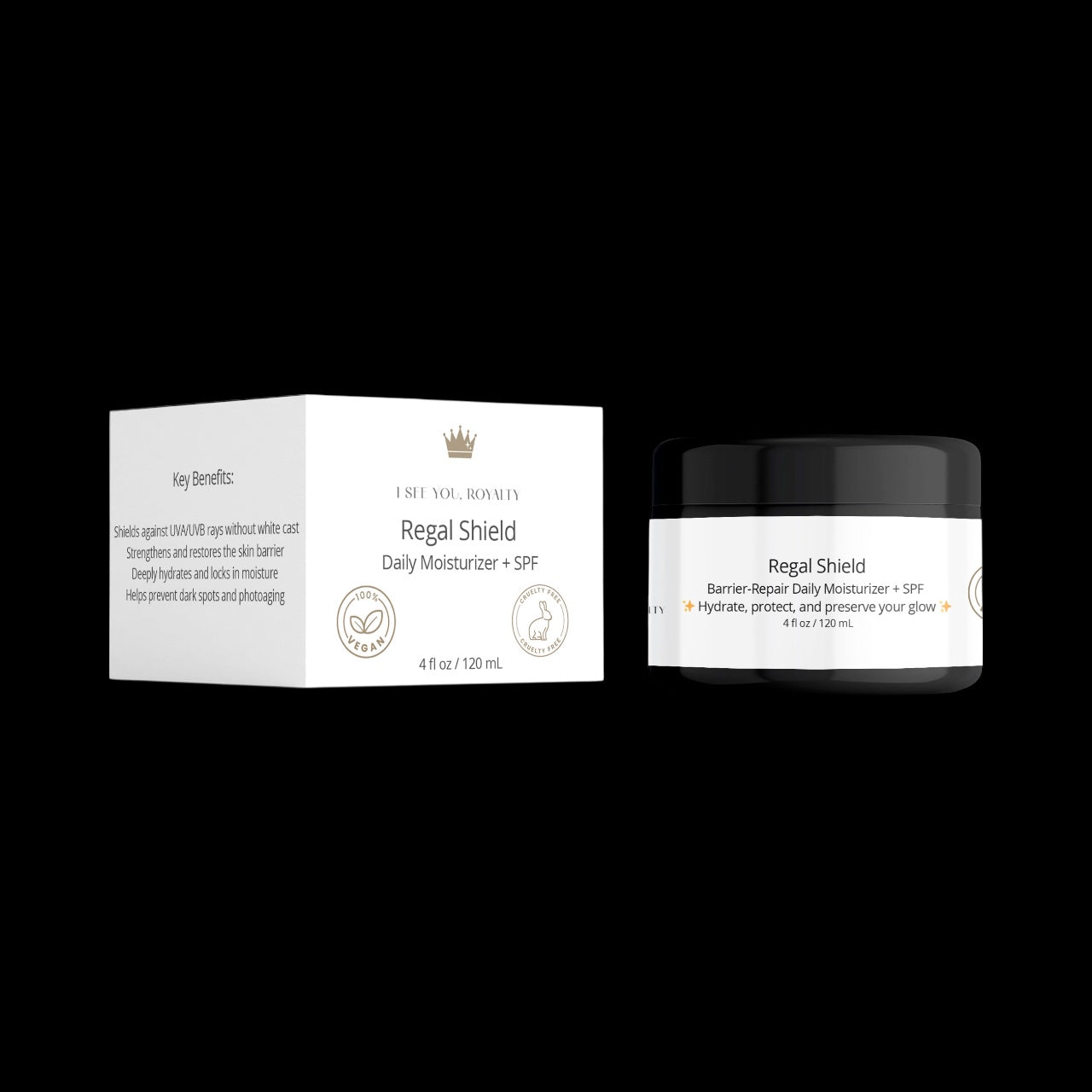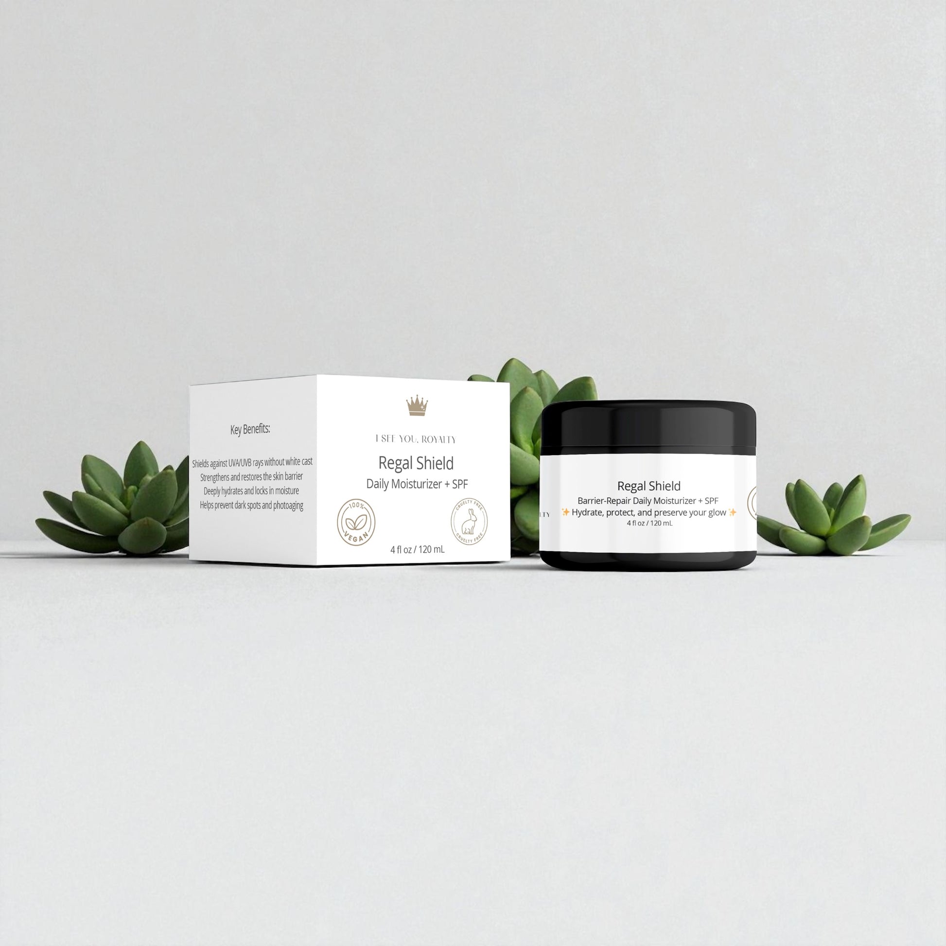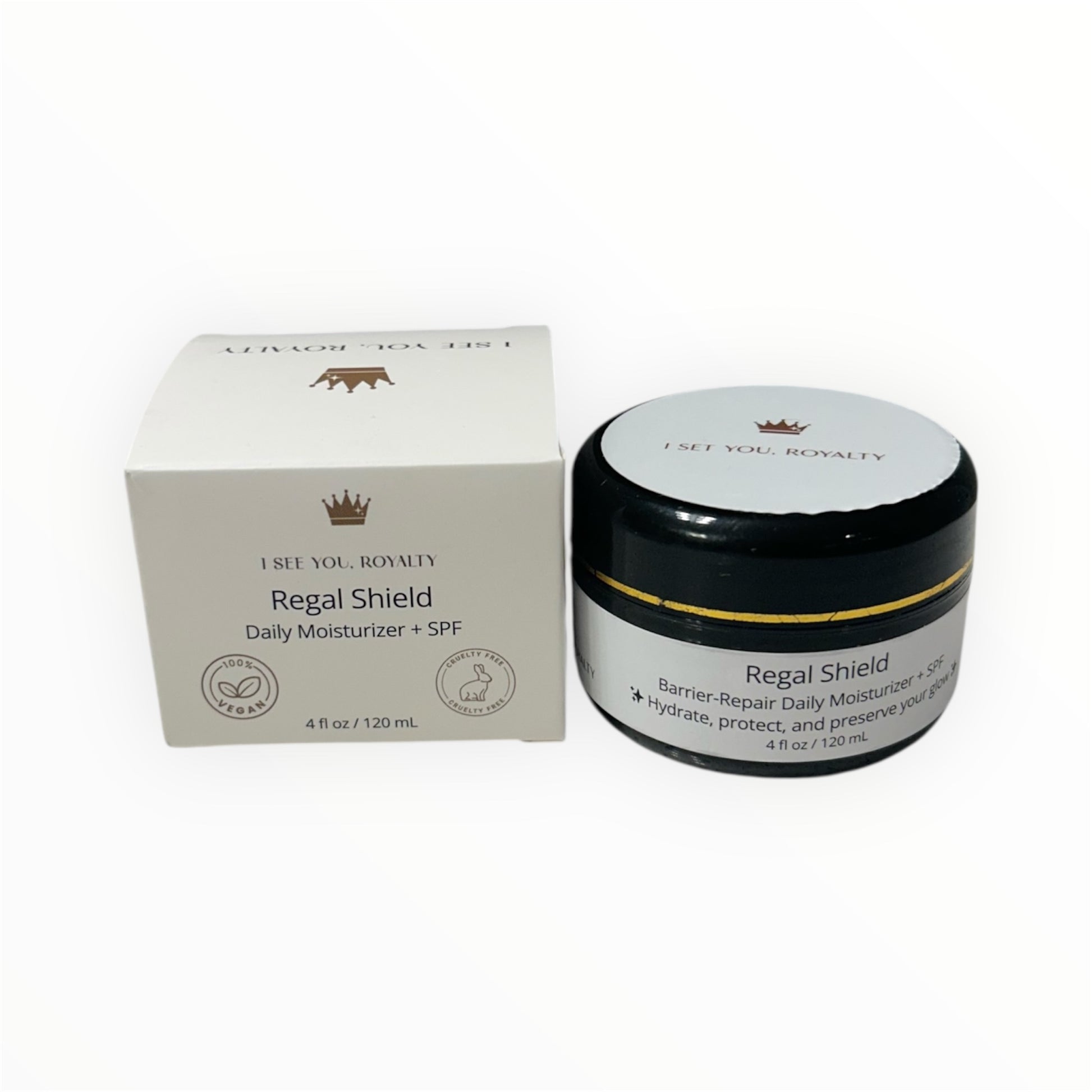Protect your crown with Regal Shield, the ultimate vegan moisturizer with SPF 19 for melanated skin. This lightweight, hydrating cream defends against UV damage while locking in moisture — all without leaving behind a chalky residue. Designed to blend seamlessly into deeper skin tones, Regal Shield is your daily armor for healthy, radiant skin.