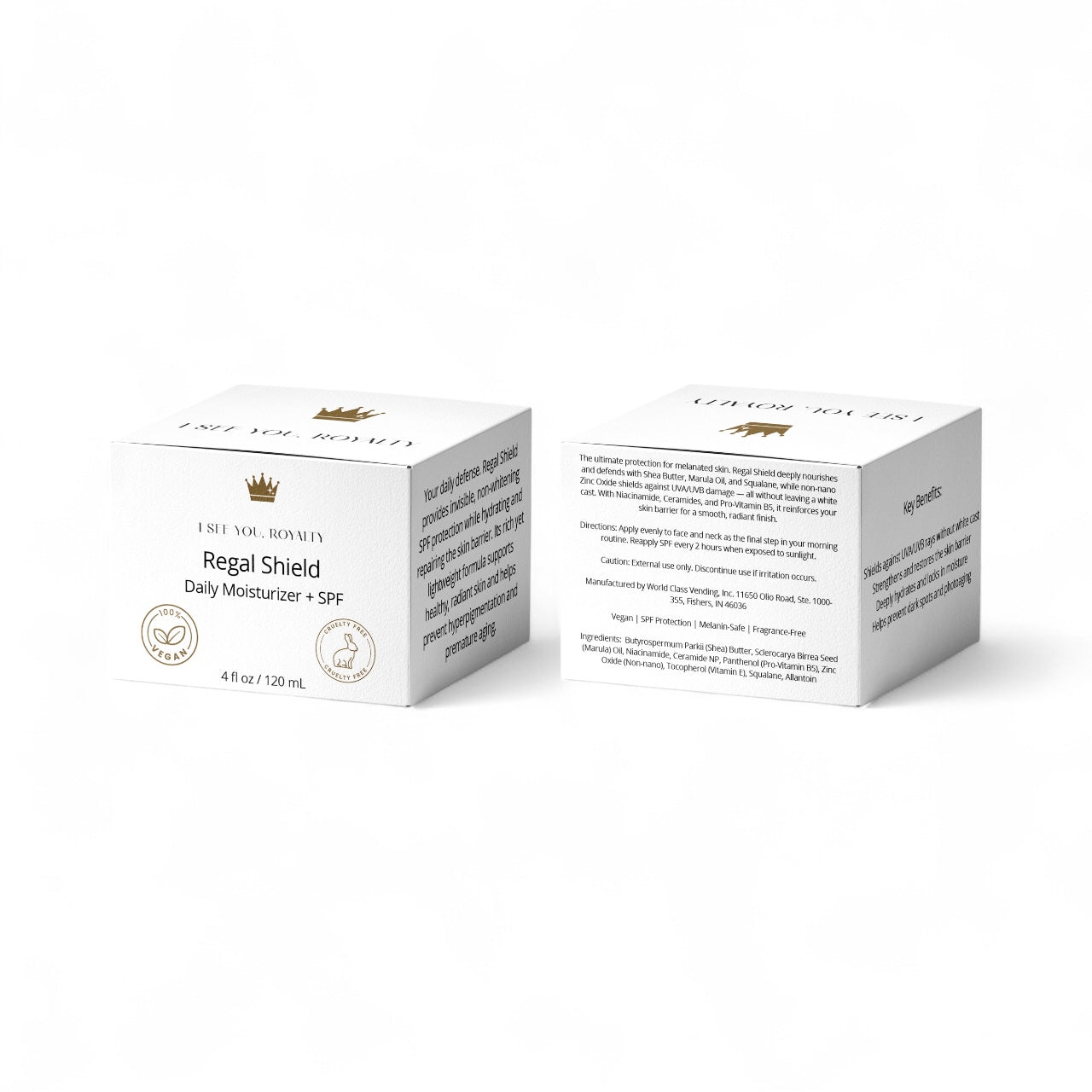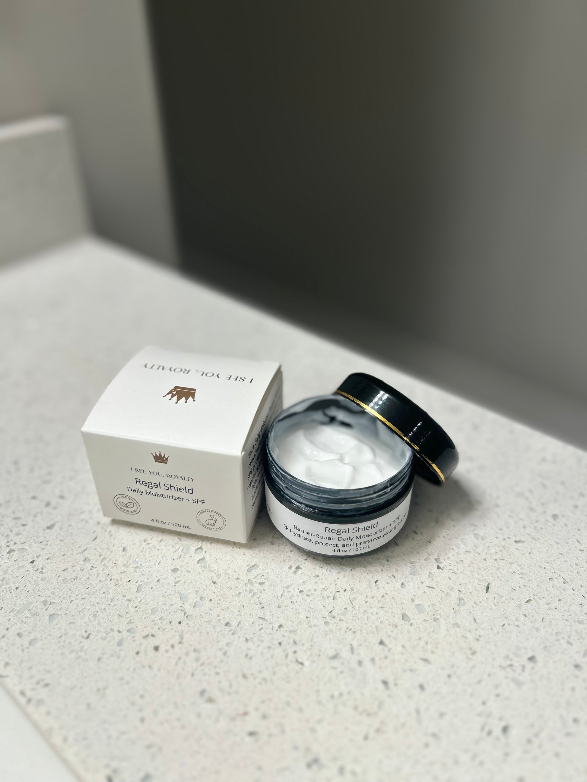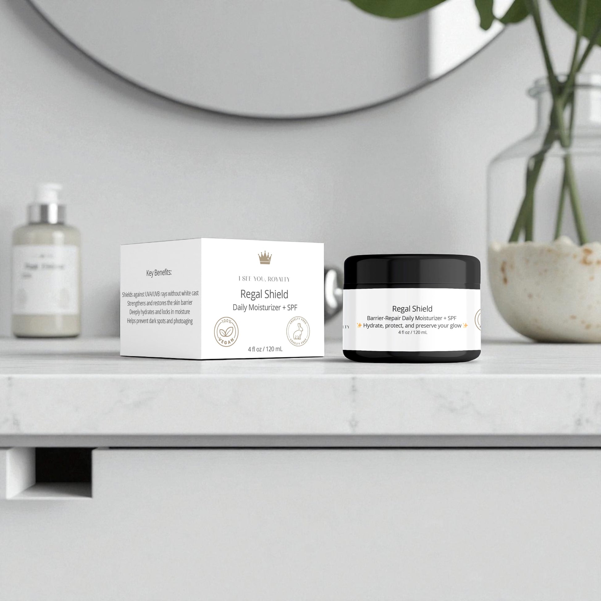 Protect your crown with Regal Shield, the ultimate vegan moisturizer with SPF 19 for melanated skin. This lightweight, hydrating cream defends against UV damage while locking in moisture — all without leaving behind a chalky residue. Designed to blend seamlessly into deeper skin tones, Regal Shield is your daily armor for healthy, radiant skin.