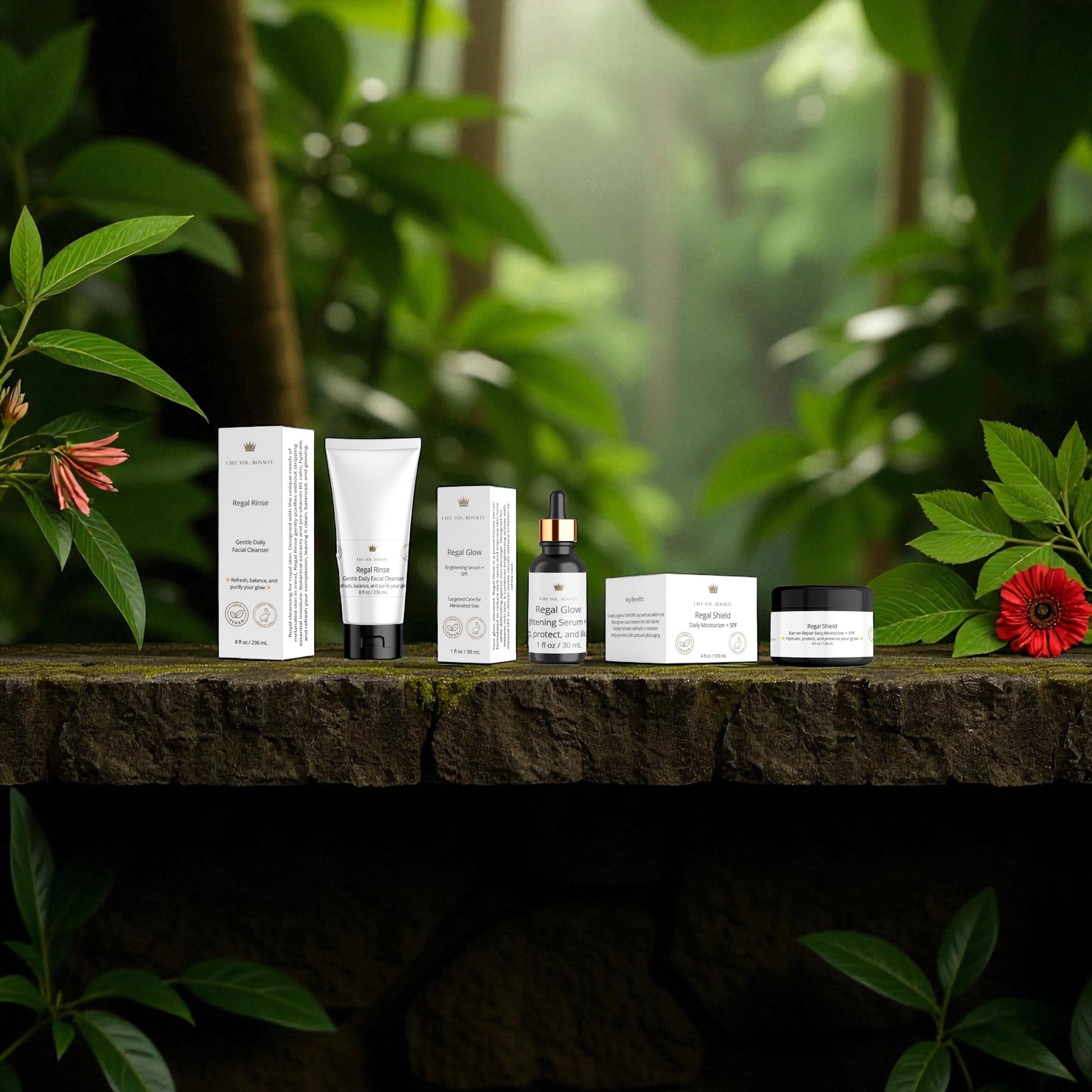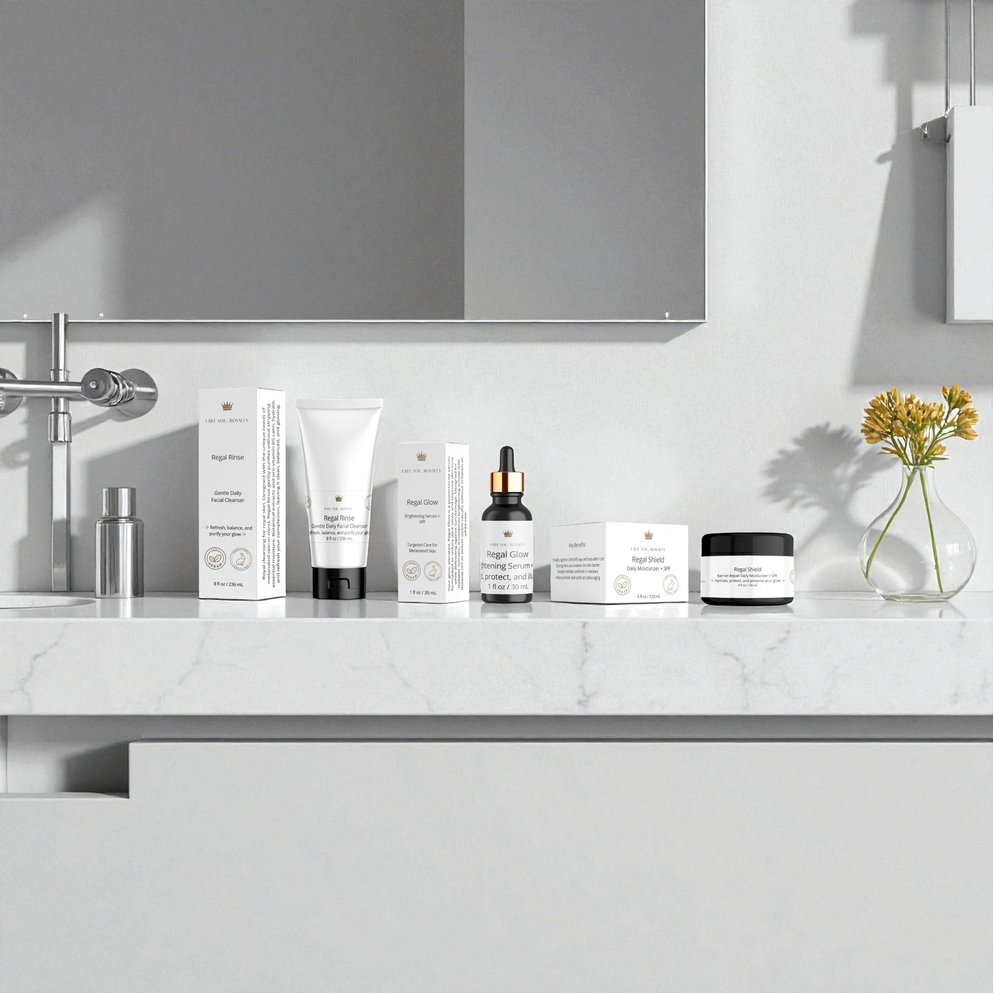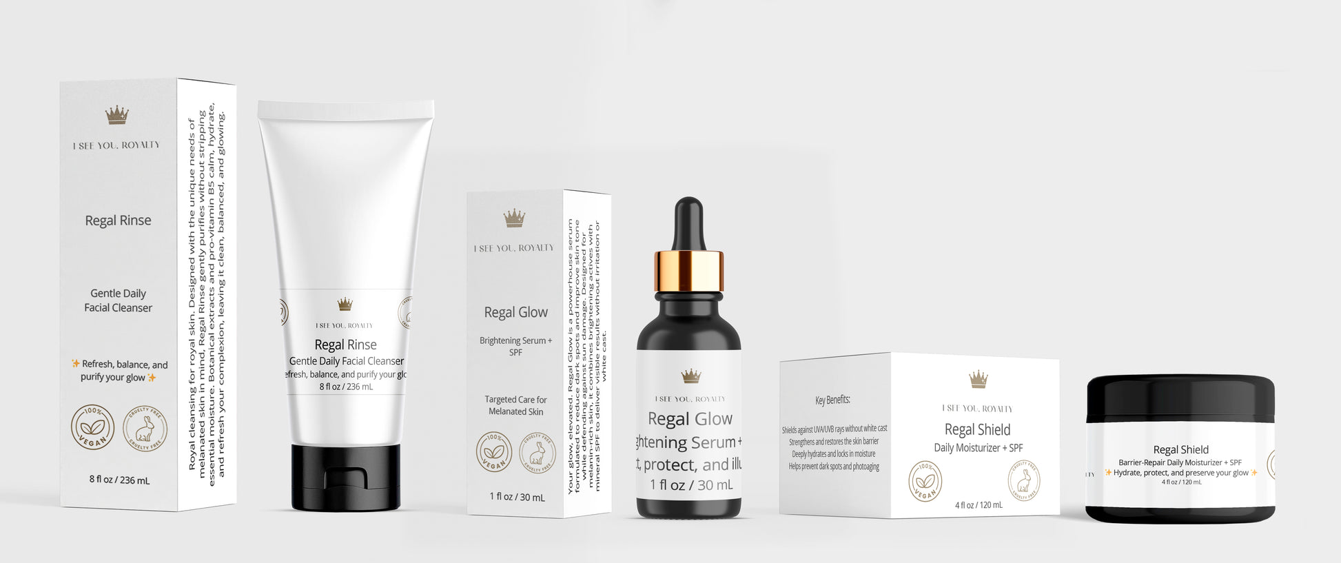 Rule your skincare ritual with The Majesty Method, a 3-step vegan skincare system designed exclusively for melanated skin. This royal trio combines Regal Rinse (daily cleanser), Regal Glow (dark spot serum with SPF 19), and Regal Shield (moisturizer with SPF 19) into one powerful routine. Together, they cleanse, brighten, and protect — delivering a healthy, even-toned glow worthy of your crown.