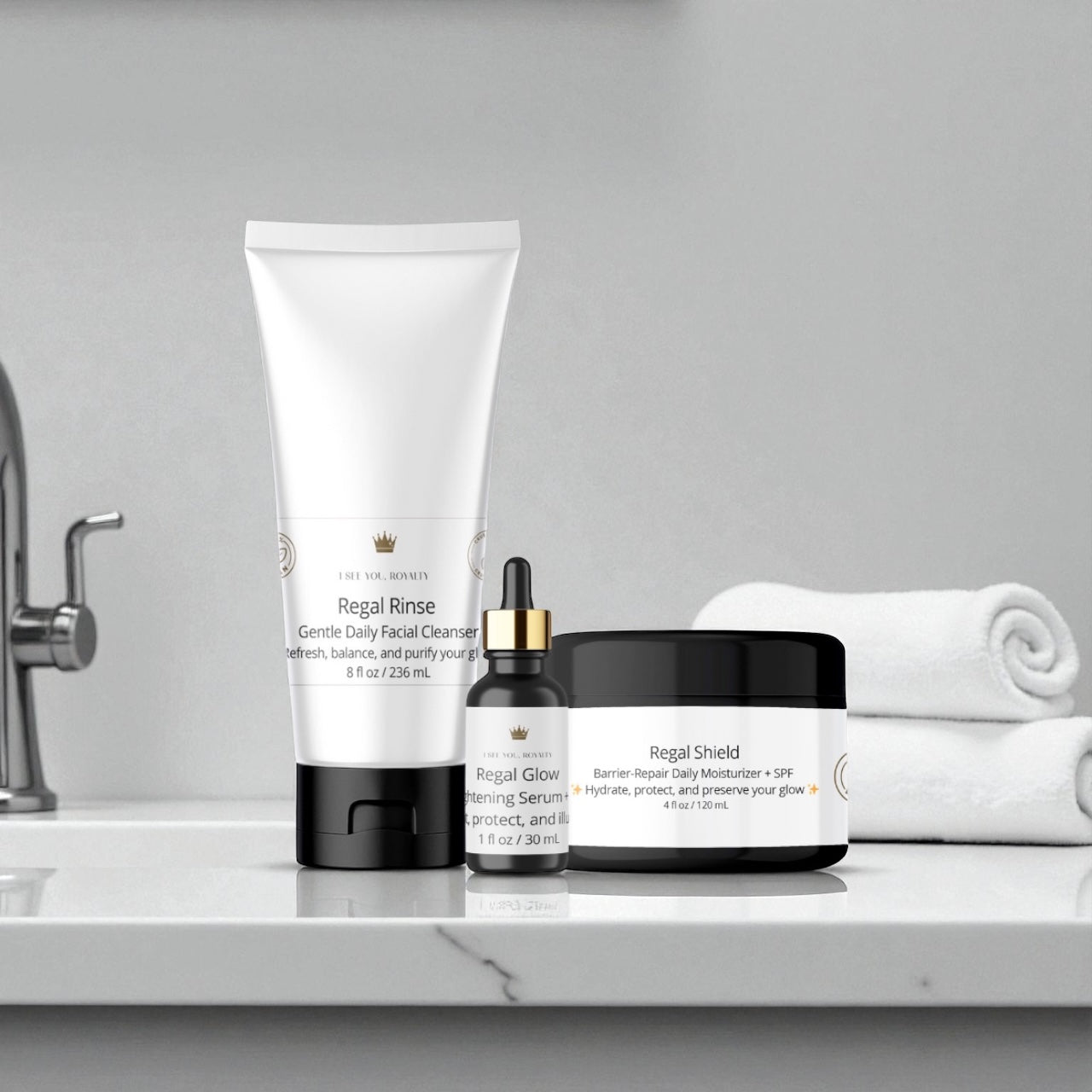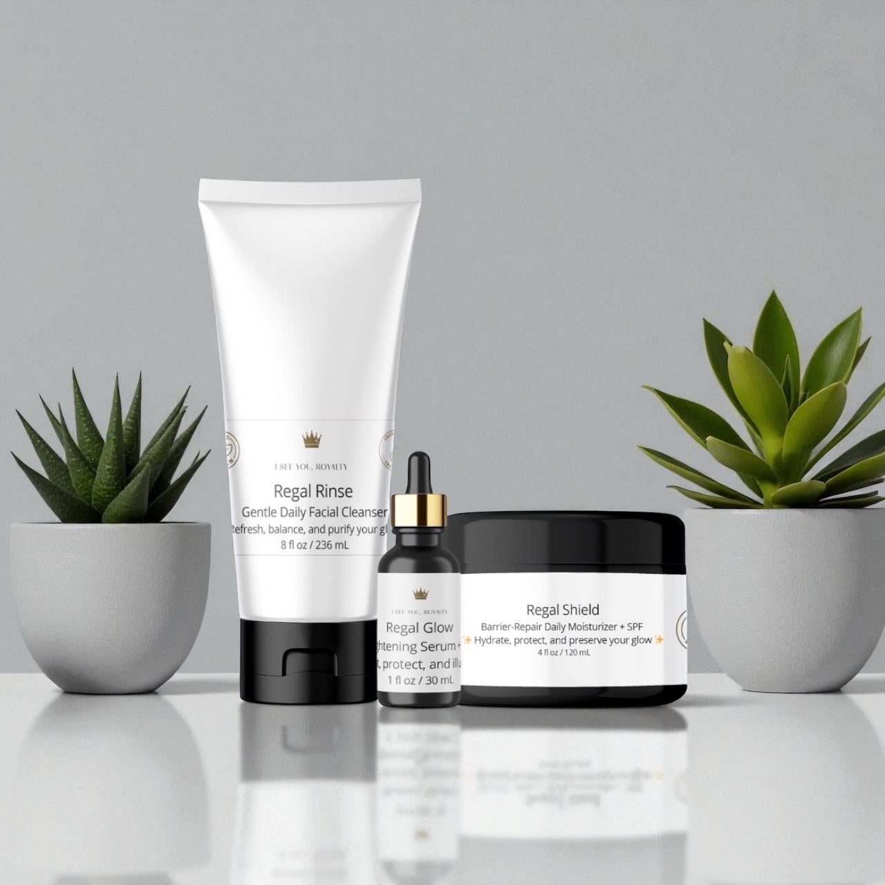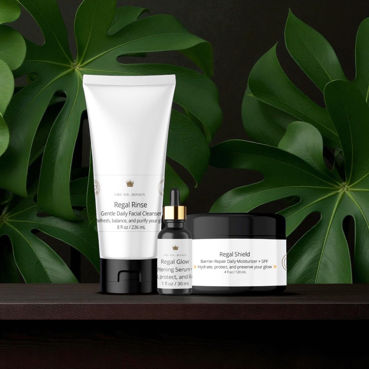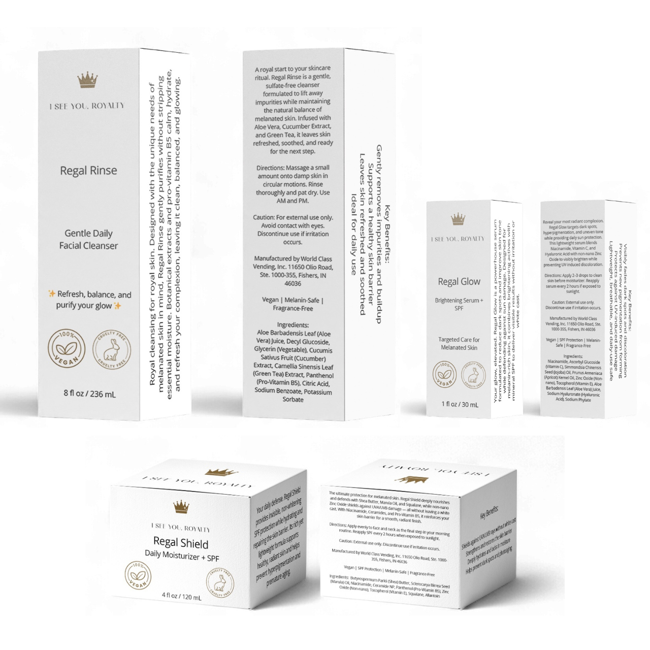 Rule your skincare ritual with The Majesty Method, a 3-step vegan skincare system designed exclusively for melanated skin. This royal trio combines Regal Rinse (daily cleanser), Regal Glow (dark spot serum with SPF 19), and Regal Shield (moisturizer with SPF 19) into one powerful routine. Together, they cleanse, brighten, and protect — delivering a healthy, even-toned glow worthy of your crown.